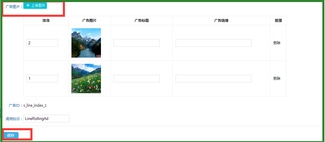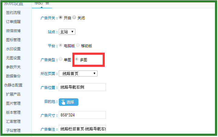 點擊修改進去廣告類型選擇多圖,然后點擊上傳圖片 備注:輪播圖建議最多添加五張