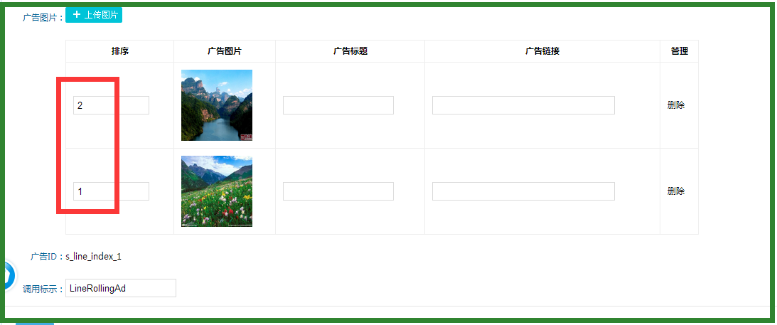 排序:如果沒有進行人工排序圖片是按照添加的順序顯示的,如果想進行排序在圖片后臺的排序按照想顯示的圖片的順序按照阿拉伯數字進行排列