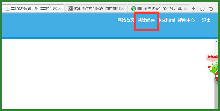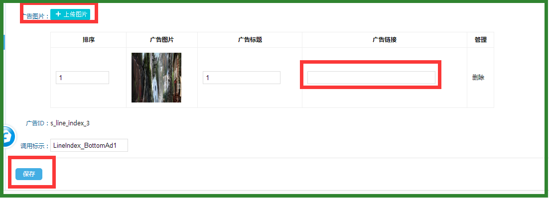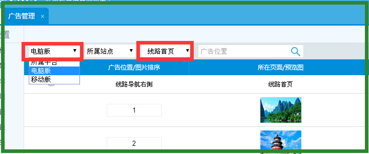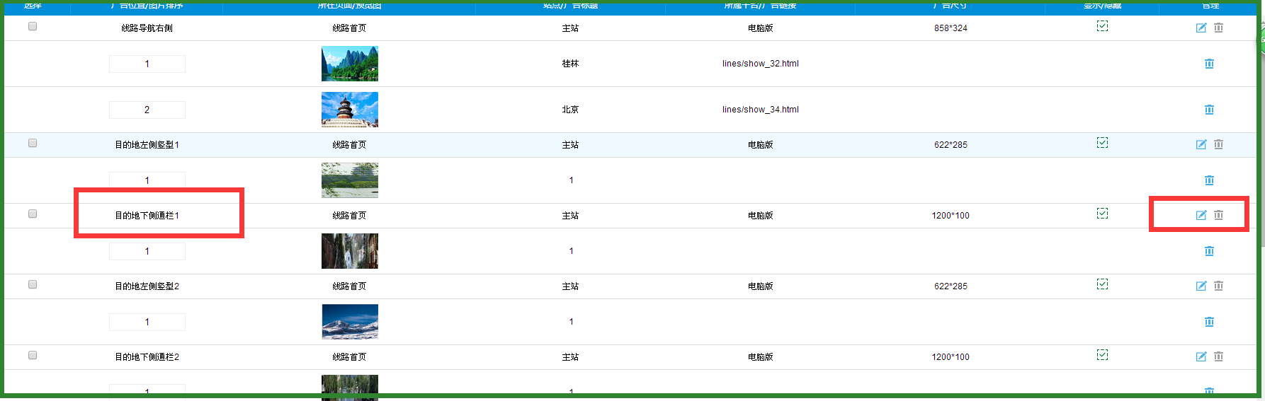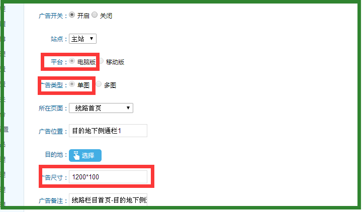 選擇線路首頁目的地下側通欄廣告(根據頁面設置的板塊,每個板塊的下側廣告,順著上傳就可以)廣告類型選擇單圖,然后選擇上傳圖片,(圖片尺寸:1200*100)點擊保存,清除緩存在首頁刷新