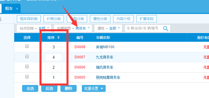 (PS:對租車產品不進行排序的情況下:前臺展示的產品順序是按照最新添加的產品的時間順序來進行展示。)