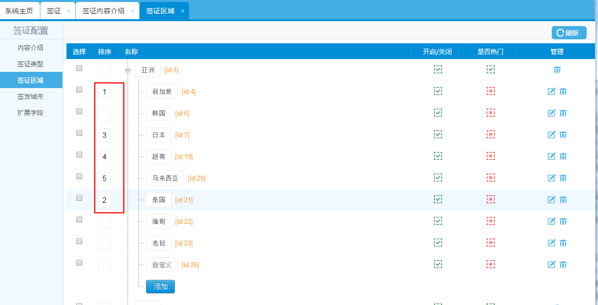 第二步:在簽證里點擊“簽證設(shè)置”進入“簽證區(qū)域”,添加國家名稱,再點擊編輯按鈕添加框內(nèi)的內(nèi)容進行添加;