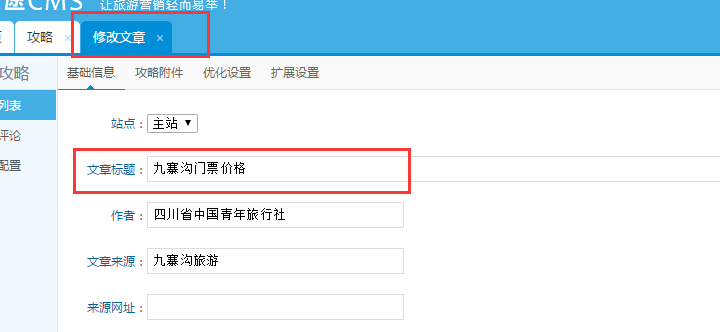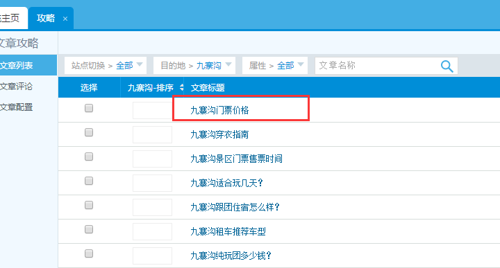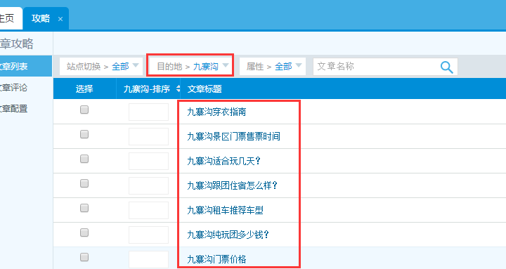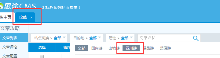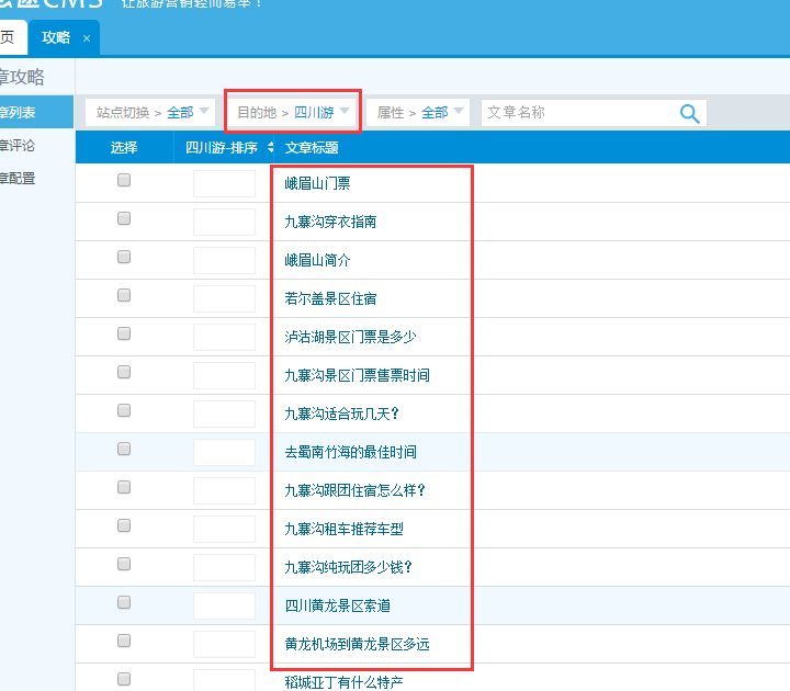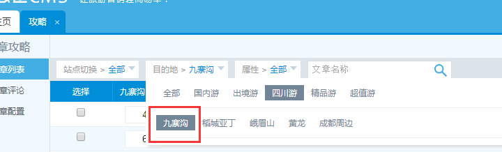 1、在后臺的軟文系統里點擊攻略,進入攻略界面,在目的地里選擇四川游這個目的地