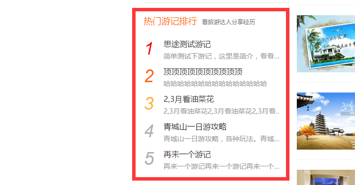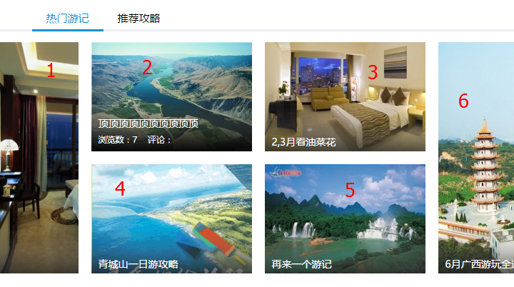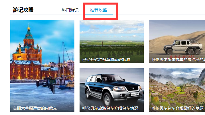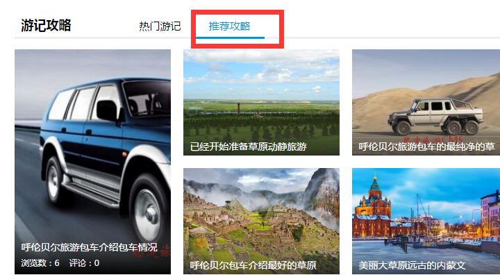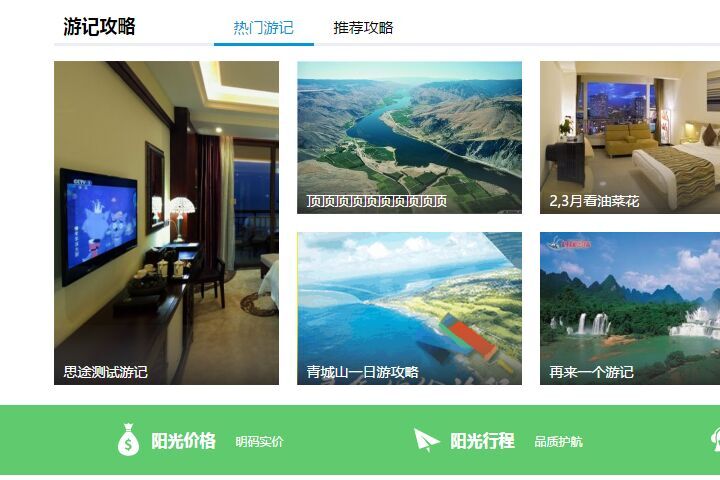 首頁上,游記攻略模塊,顯示的是網(wǎng)站上的熱門游記和推薦攻略