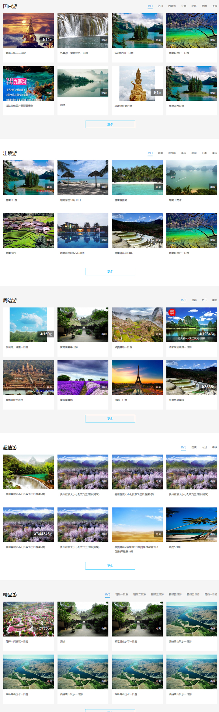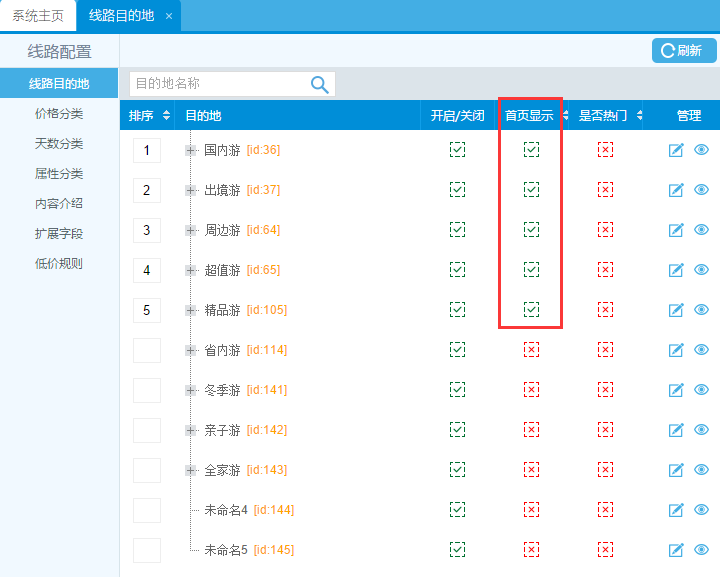 1、此模板是線路首頁模板,所有操作都是在后臺(tái)線路模塊設(shè)置。先將線路目的地中將一級(jí)目的地和下級(jí)目的地全部開啟,此版塊默認(rèn)顯示5個(gè)目的地模塊,只需要選擇5個(gè)一級(jí)目的地的將首頁顯示開啟,前臺(tái)就可顯示這5個(gè)目的地模塊。可通過數(shù)字排序來控制著5個(gè)目的模塊的顯示