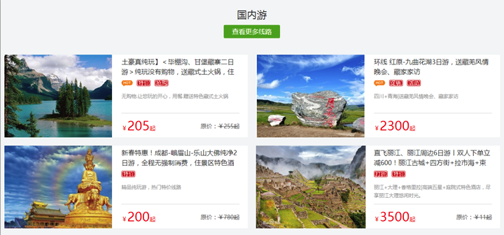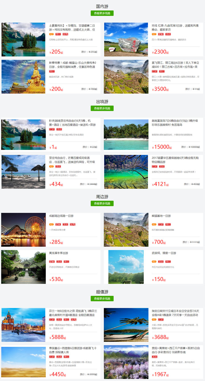 此模板是以線路為主的首頁模板,首頁共可設置四個線路板塊,以下圖為例共有國內游、出境游、周邊游和超值游: