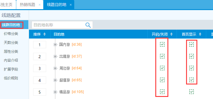 2、在線路目的地中(一級目的地或者二級目的地)設置開啟狀態,并且開啟首頁顯示(只需開啟4個,超出4個只顯示排序中的前4個)