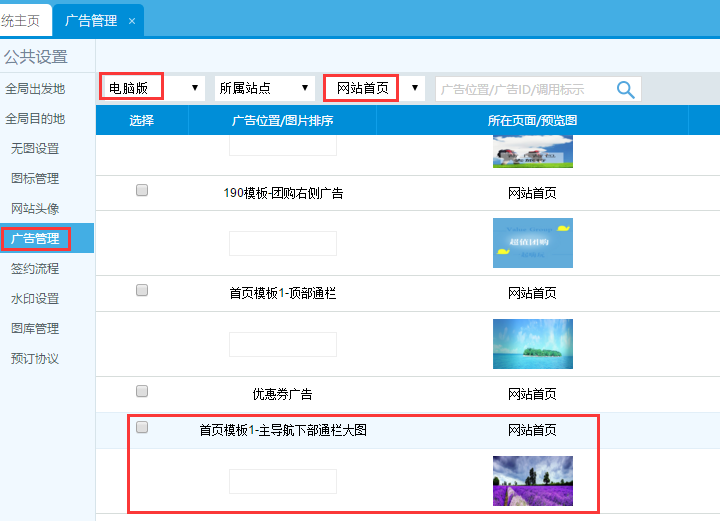 操作位置》站點管理》》公共設置》廣告管理